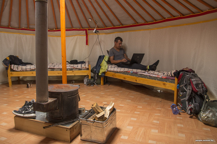 Юрта, мы почетные гости. Издавая короткие «буль», специальный черпак на палке водружался в кожаный бурдюк. Пенящийся напиток многократно извлекался на свет. Чаша с кумысом переходила по кругу, от нас к хозяевам. Огни печки отражались на внушительной бутыли местной водки. «Бедный Сашка, ему отдуваться за обоих», — мелькнуло тогда у меня. Однако смелый взор товарища не выражал страха или смятения. Словно принимая вызов, дружище спокойно взирал на оппонентов.