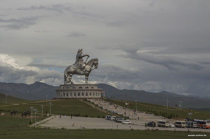 Каждая страна, в зависимости от степени развития, находит свои скрепы, настойчиво предлагая гражданам ими гордиться. У кого-то это «билль о правах», у кого-то — «деды воевали», у монголов идея фикс — это Чингисхан. Грозный воитель взирает здесь отовсюду: с плакатов, денег, водочных этикеток, пачек с пельменями. Вполне закономерно, что размеры монумента сопоставимы с возлагаемыми задачами. Сам комплекс находится километрах в пятидесяти от столицы и, наверное, имеет транспортное сообщение с ней. Но хороший монгольский автостоп так и не дал нам это проверить.