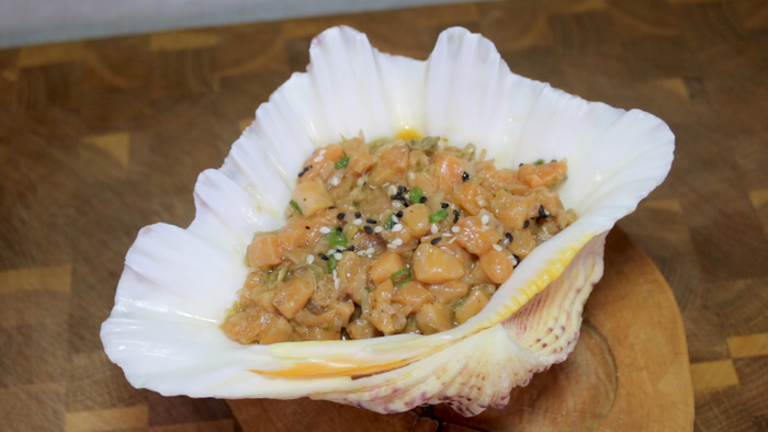 Приготовленные кабачки выкладываем на блюдо. Украшаем их мелко нарезанной зеленью, либо, как сделал это я, обжаренным кунжутом и подаём к столу.