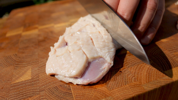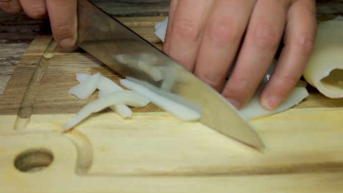 В начале рецепта необходимо подготовить кабачок. Его нужно нарезать ломтиками. А потом каждый ломтик разделить на брусочки. Старайтесь, чтобы толщина брусочков не превышала 1.5см.