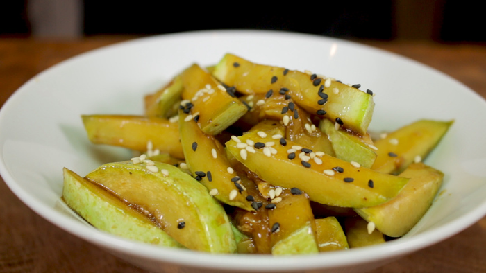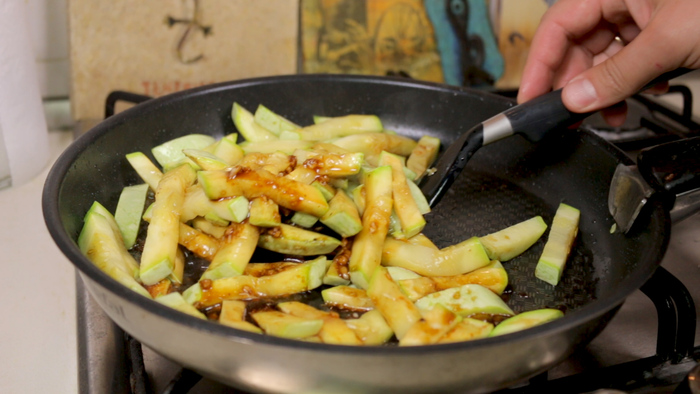 Жареные кабачки на сковороде в соевом соусе с чесноком