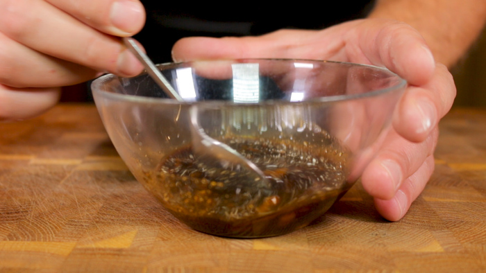 Следующим шагом приготовим заправку. Для этого в глубокую миску наливаем 50 мл. соевого соуса. Добавляем к нему 2 зубчика чеснока пропущенных через пресс для чеснока, 1 ч.л. сахара, 1 ч.л. крахмала и немного свежемолотого перца. Перемешиваем всё вместе. Заправка для кабачков готова.
