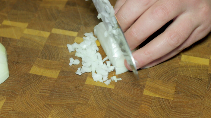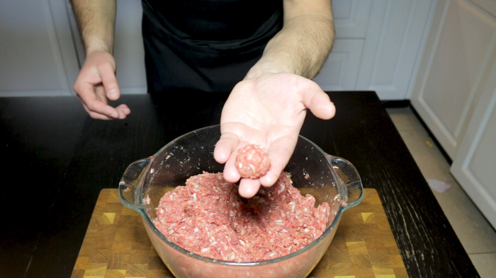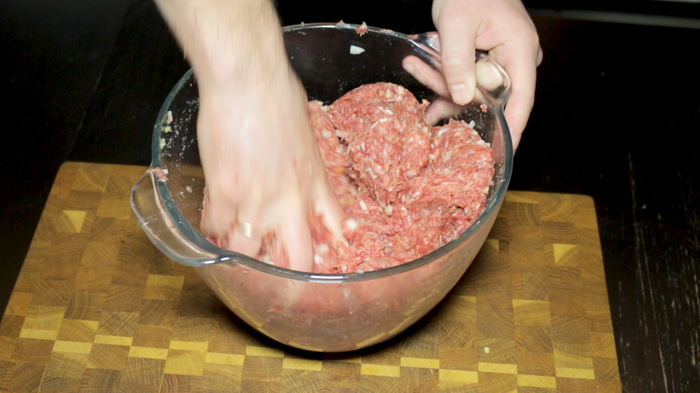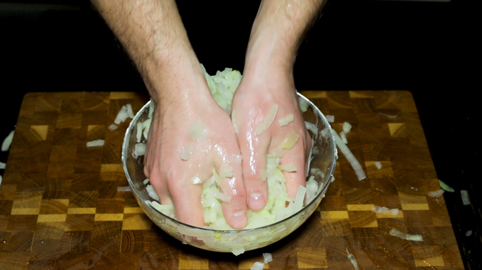 Нарезаем лук. Я буду нарезать его полукольцами, лично мне так проще всего. Вы наверняка заметили, что на 4 кг мяса я взял только 1.5 кг лука, объясню почему. Если вы будете мариновать мясо долго, как это буду делать я, то не используйте слишком много лука, чтобы он не дал неприятный запах мясу, однако если в вашем случае мясо будет мариноваться несколько часов, то наоборот возьмите лука побольше. Лук необходимо присолить и немного промять, чтобы он начал выделять сок.