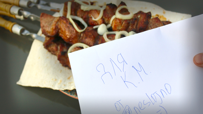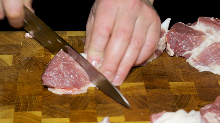 Мясо необходимо проверить на наличие пленочки с внутренней стороны ребер. Если она присутствует, то проще всего её удалить при помощи чайной ложки. Просто запускаем под неё ложку обратной стороной, подцепляем пленочку и снимаем её. Если это не сделать, то во первых она будет мешать мясу мариноваться, во вторых в готовом шашлыке она будет достаточно жесткая