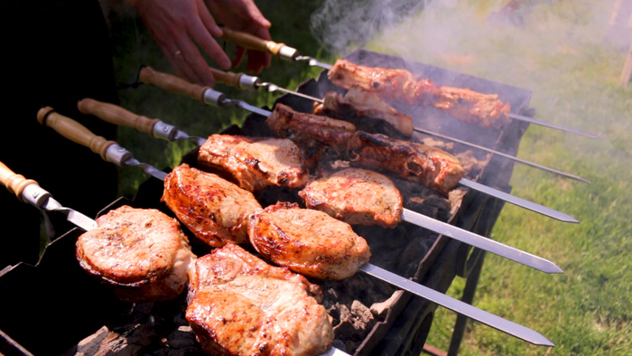 По времени приготовления шашлыка точные значения сказать трудно, многое зависит от температуры углей, от того на сколько толстые у вас куски мяса и как часто вы их переворачиваете. Обычно на приготовление уходит минут 15-20. Главное помнить, что корейка само по себе мясо достаточно постное, поэтому будьте внимательны, не пересушите его.