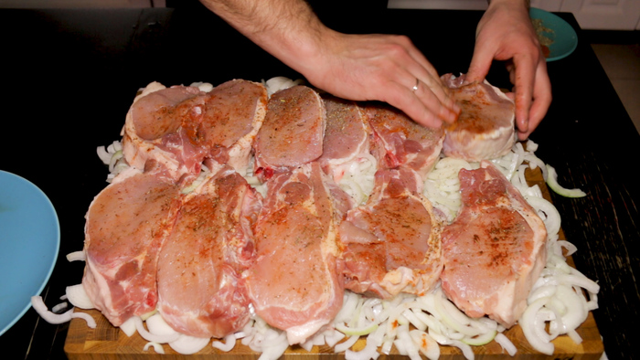 Выкладываем мясо прямо поверх лука. Сверху посыпаем его сладкой паприкой, сушеным базиликом, красным острым перцем и черным свежемолотым. Распределяем специи равномерно по всей поверхности каждого куска мяса. Переворачиваем мясо и повторяем те же процедуры с обратной стороны. Обратите внимание на то, что если мясо лежит на луке, то специи, которые не попадут на мясо, попадут на лук и всё равно останутся в маринаде.