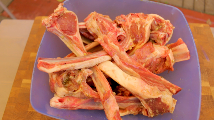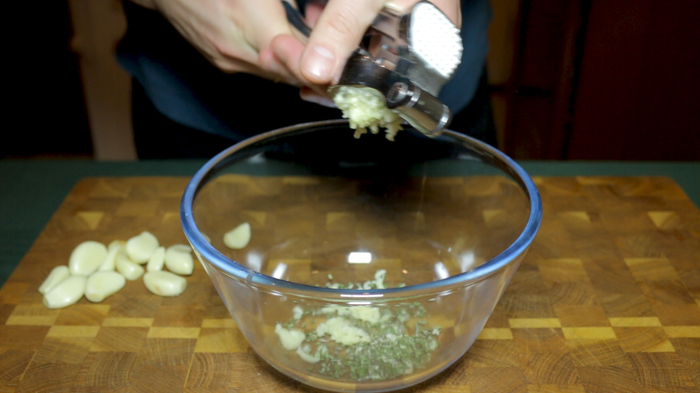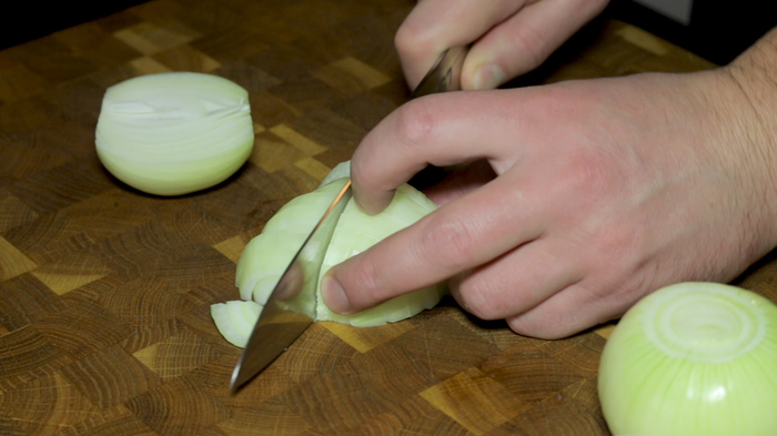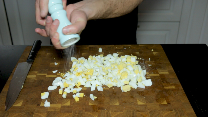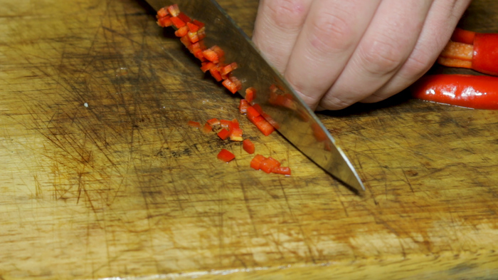 Красный чили перец разрезаем на 2 части и извлекаем из него семена. Затем мелко его нарезаем. Я делаю это сначала соломкой, а потом рублю её на мелкие кубики.