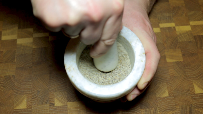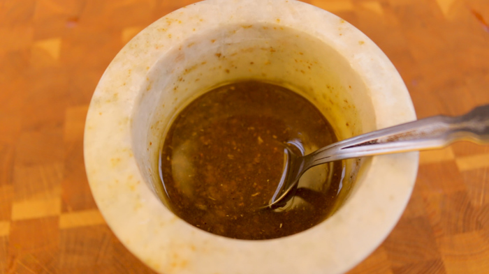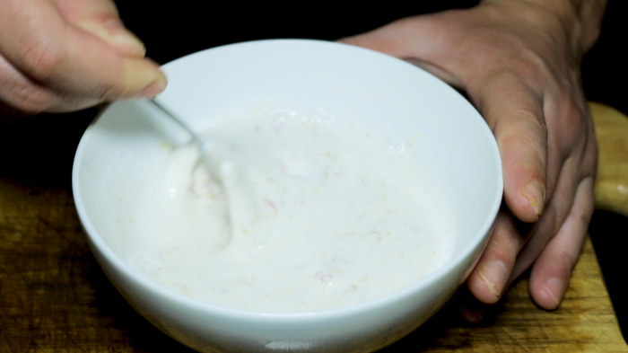 Приступаем к приготовлению национального индонезийского соуса сатэй. В миске смешиваем 3 ст.л. арахисовой пасты, 200мл кокосовых сливок и добавляем половину чили перца, который мы приготовили ранее. Перемешиваем содержимое миски.