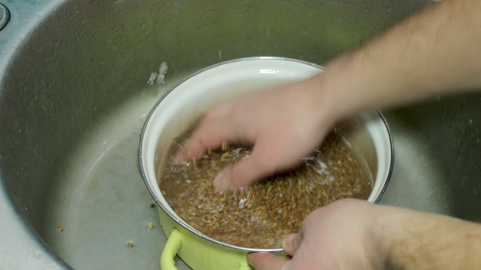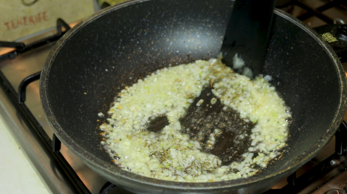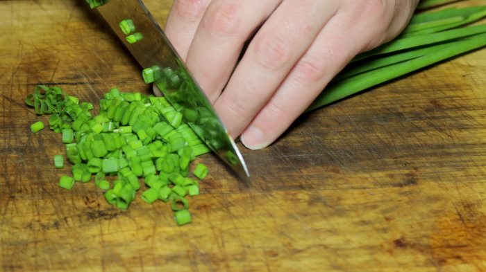 Мелко нарезаем пучок зеленого лука. Отмечу, что для приготовления нам потребуется только верхняя часть побегов, поэтому корешки сразу отрезаем. Также надо мелко нарезать кинзу. Я делаю это заранее, она пригодится мне в самом конце приготовления.
