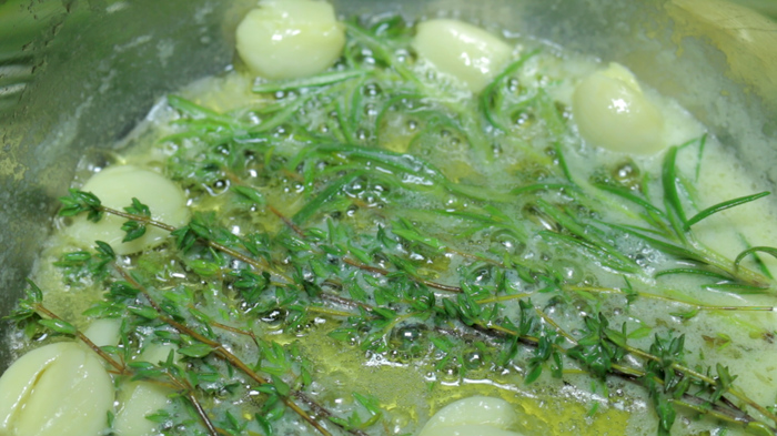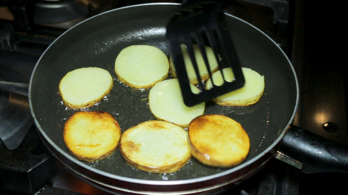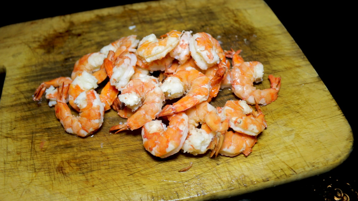 Начинаем приготовление с картофеля. Я не буду его чистить, а только помою и разрежу на 2 половинки, чтобы он быстрее сварился. Воду в кастрюле с картофелем обязательно надо присолить. Картофель отваривается в течение 15 минут до мягкости, затем вода сливается, а картофель нарезается кружками толщиной примерно пол сантиметра. После этого обжариваем его на растительном масле пока он не подзолотится.Отвариваем креветки, затем охлаждаем их и очищаем. После очистки обязательно удалите из креветок пищевод, потому что в нём может содержаться песок и прочие неприятные вещи.