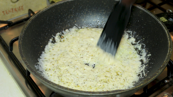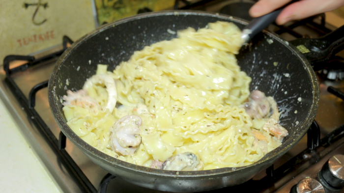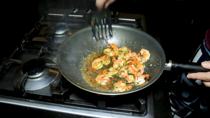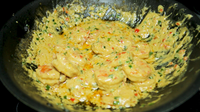 Буквально через 1 минуту добавляем к креветкам соус сатэй. Перемешиваем содержимое сковороды, чтобы соус обволакивал каждую креветку. Когда соус прогреется, он быстро загустеет, и креветки будут готовы.