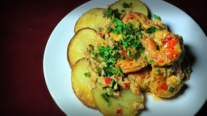 Сервируем блюдо. Выкладываем на тарелку ломтики обжаренной картошки. Выкладываем креветки, которые мы приготовили в соусе сатэй. Излишки соуса добавляем на картошку. Украшаем блюдо зеленью кинзы, порезанной ранее.