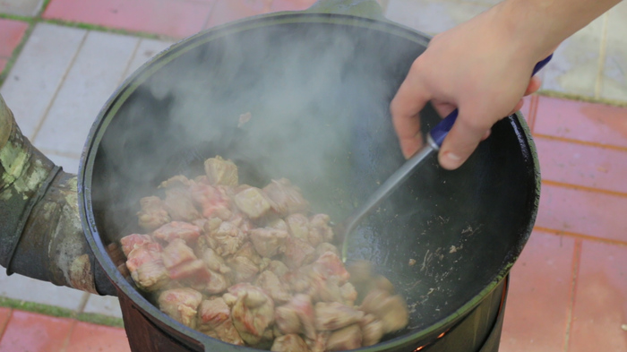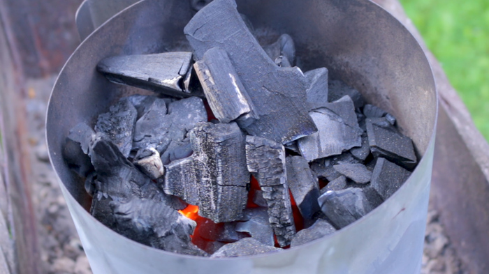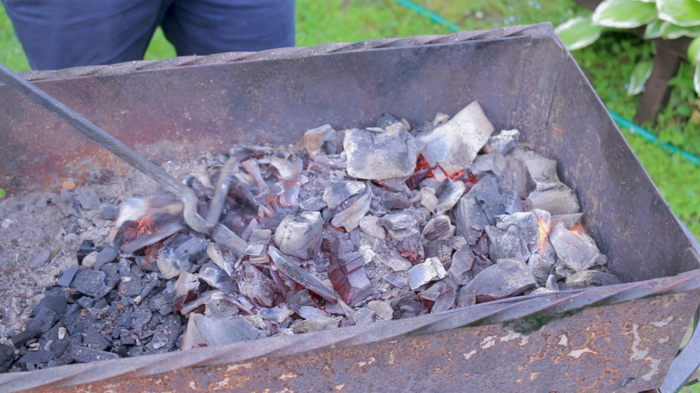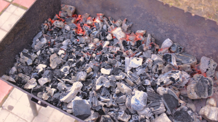 К этому времени угли должны разгореться, перекладываем их в мангал. Разравниваем при помощи кочерги. Даём углям немного остыть. Чтобы понять, что угли готовы к жарке мяса поднесите к ним руку. Если вы сможете продержать её 7-8 секунд, то температура оптимальная. Если нет, углям надо дать ещё время чтобы они остыли.