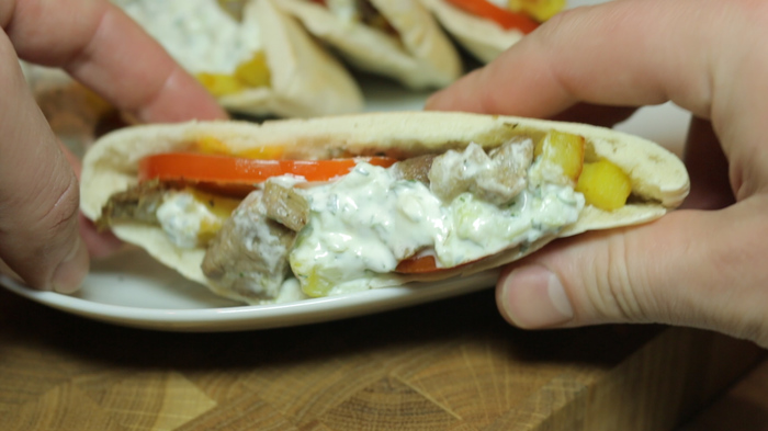 Сервируем шашлык из баранины с овощами и маринованным луком. Подаём на стол. Приятного аппетита!