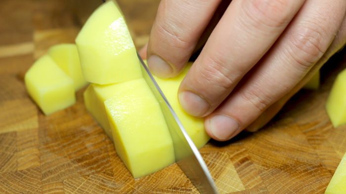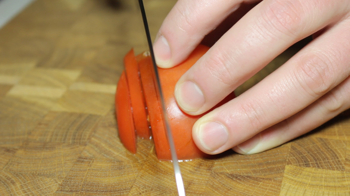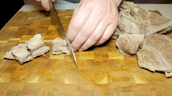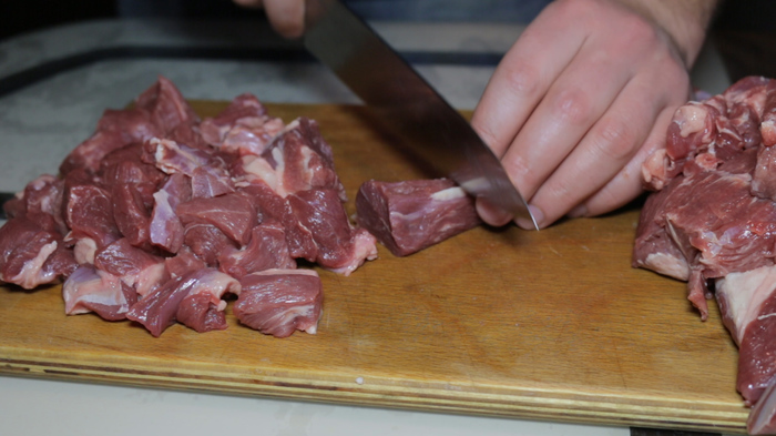 Разделываем баранью корейку на порционные кусочки по ребрам. Чаще всего баранину разделывают на кусочки толщиной в одно ребро. При такой нарезке мясо быстро прожарится и его удобно будет есть.