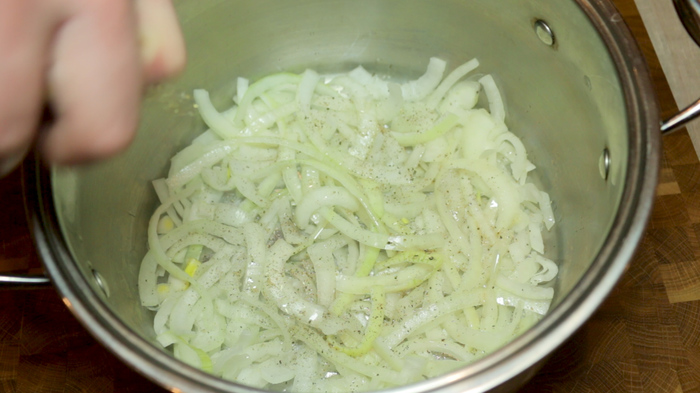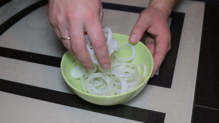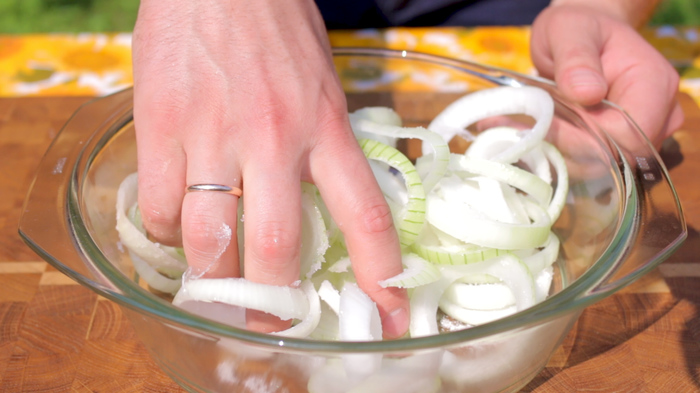Пока мясо маринуется, я решил не тратить время даром и приготовить самую лучшую закуску к любому шашлыку. Разумеется это маринованный лук! Несколько луковиц нарезаем кружками. Разделяем кружки лука на кольца и помещаем их в глубокую тарелку. Добавляем соль, сахар и уксус. Все приправы добавляются из расчета 1 ч.л. на среднюю головку лука. Перемешиваем содержимое тарелки.