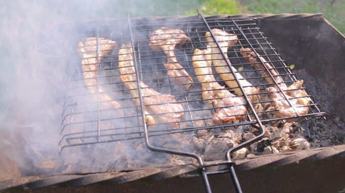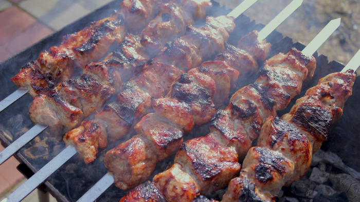 Когда температура будет оптимальной, выкладываем шашлык на мангал. На его приготовление у вас уйдет около 15 минут. Всё это время не рекомендую оставлять шашлык без присмотра, иначе он легко может сгореть.