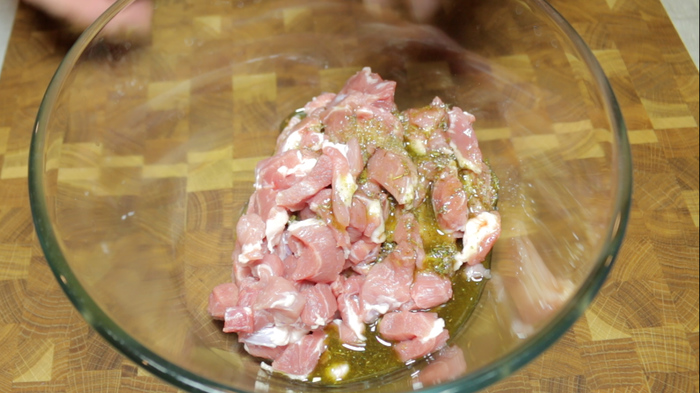 Перемещаем мясо в стеклянную или эмалированную посуду. Добавляем к нему маринад и распределяем его так, чтобы специи равномерно покрывали каждый кусок баранины. Оставляем мясо мариноваться в холодильнике на 2 часа.