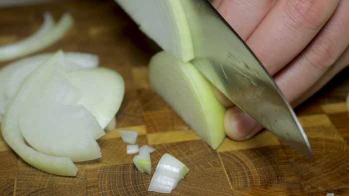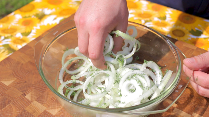 При желании маринованный лук можно украсить зеленью. Лучше всего, на мой взгляд, для этих целей подходит укроп. Мелко его нарезаем. Добавляем в тарелку с луком и перемешиваем.