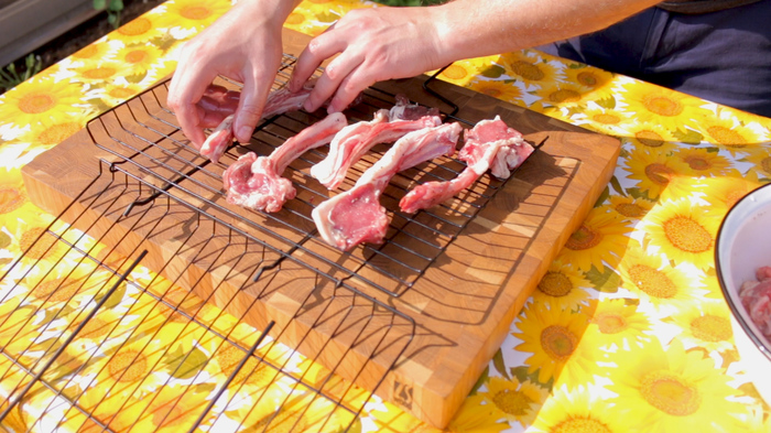 Пока угли разгораются, выкладываем мясо на решетку. Вы не ослышались, именно на решетке я предпочитаю готовить шашлык из бараньей корейки на кости. Связано это с тем, что именно на решетке мясо можно расположить с необходимыми промежутками между кусками и не бояться, что оно сдвинется, либо какая-то его часть будет ниже другой и подгорит. На самом деле это важный момент, когда вы готовите мясо на мангале.