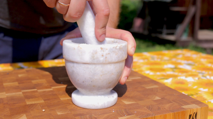 У меня мясо молодого барашка, поэтому при мариновании я умышленно не буду его ничем размягчать, а лишь подчеркну его вкус соответствующими специями. В ступку помещаем 1ч.л. кориандра, 1.5 ч.л. перца черного горошком, 2 ч.л. соли, и совсем немного зиры. С зирой рекомендую быть аккуратным, потому что данная специя обладает мощным ароматом и легко может перебить аромат других специй. Перетираем специи. Наливаем в ступку немного растительного масла и перемешиваем её содержимое до однородного состояния.