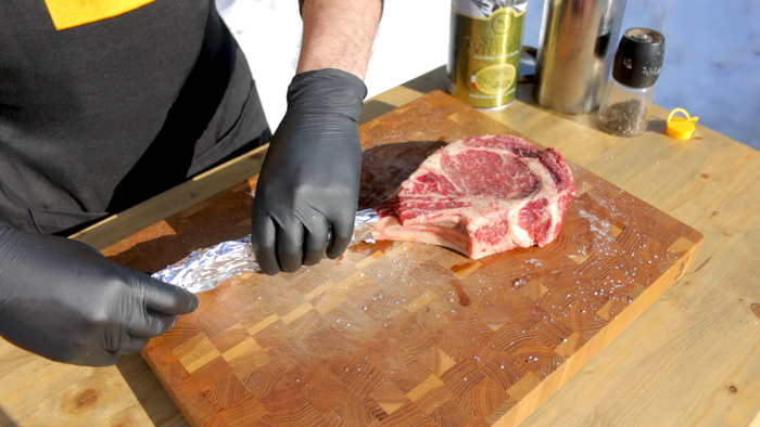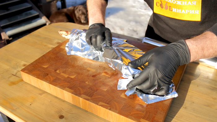 Стейки мы будем запекать на гриле, на ольховой дощечке, поэтому перед приготовлением саму дощечку необходимо замочить в воде на 6 часов.