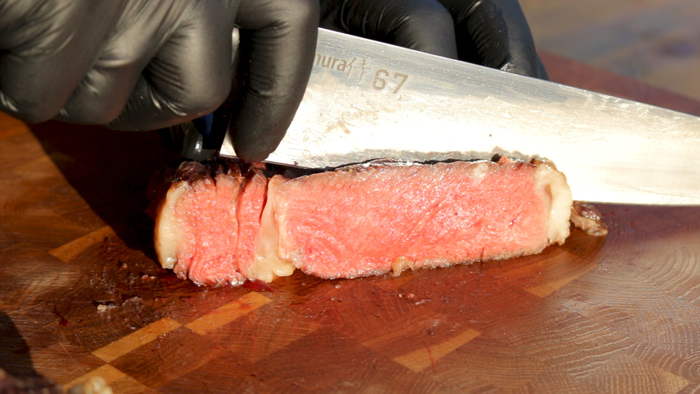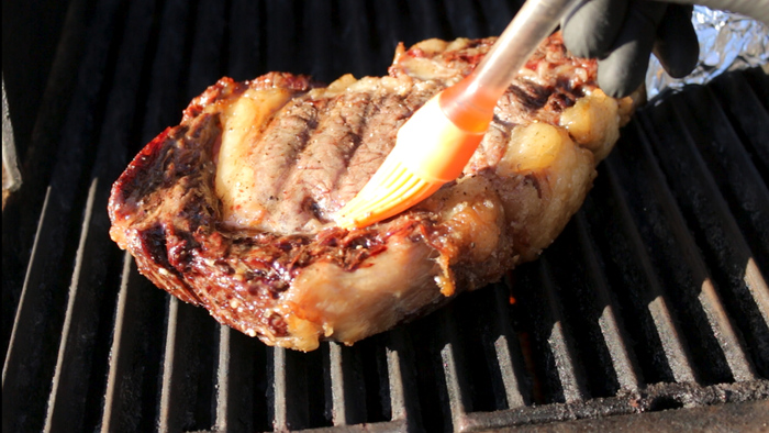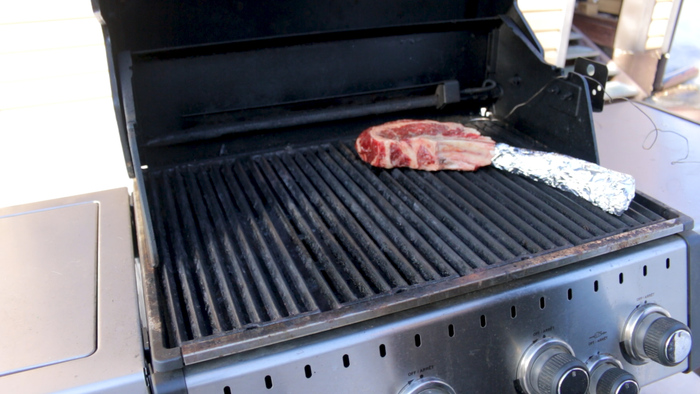 Отправляем стейки на гриль. Вставляем в середину одного из стейков щуп кулинарного термометра. Гриль закрываем. На термометре выставляем температуру 56 градусов и ждём пока рыба будет готова. В моём случае через 13 минут стейки дошли до желаемой температуры. Пришло время снимать их с огня. Приятного аппетита!