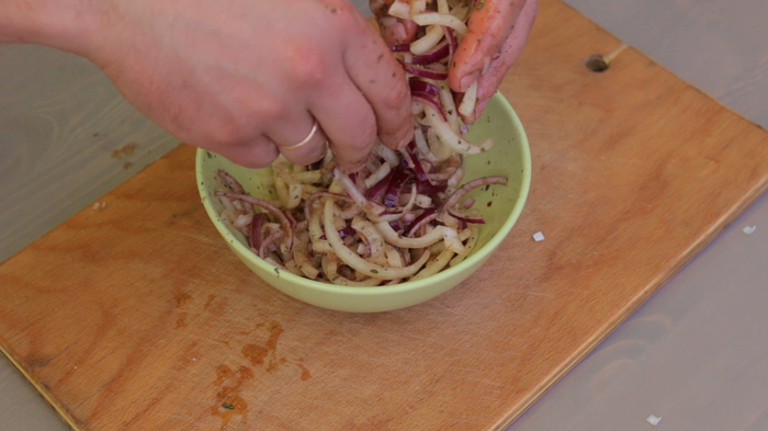 Теперь переходим к основной изюминке рецепта – вустерширский соус! Наносим его на оба стейка, слегка втирая. Переворачиваем стейки и повторяем процедуру. Убираем стайки мариноваться на полчаса.