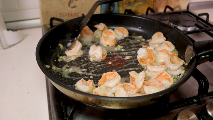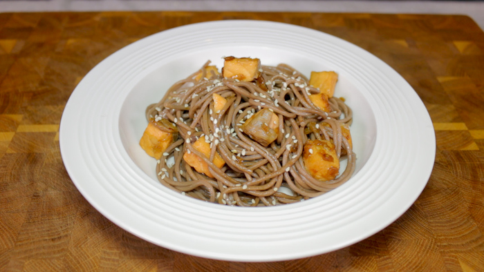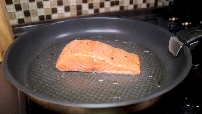 Переходим к филе лосося. Его филе необходимо посолить и поперчить. Затем обжариваем его на сковороде на максимальном огне по 2.5 минуты с каждой стороны и снимаем с огня.