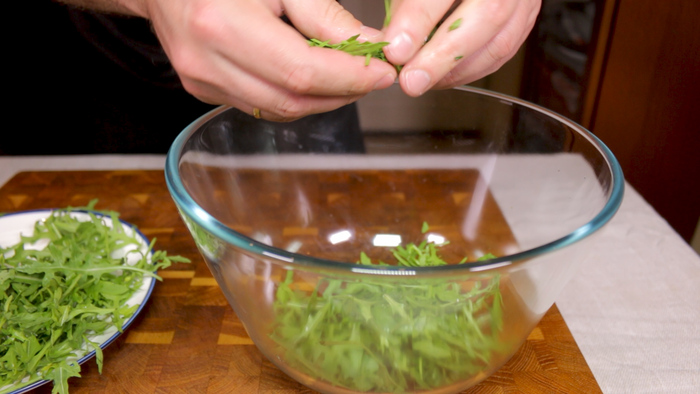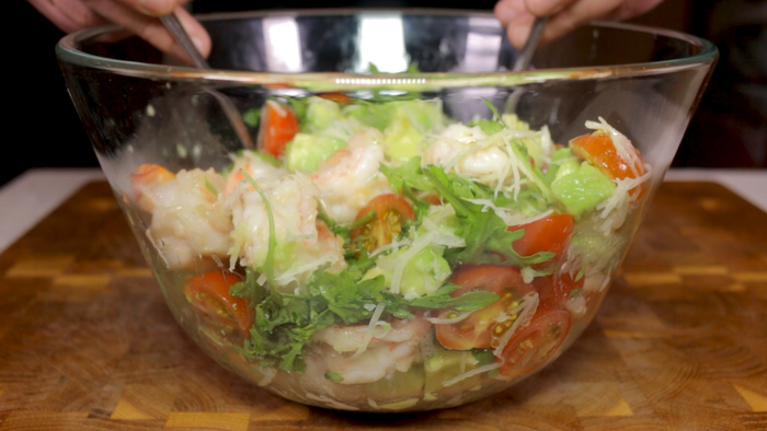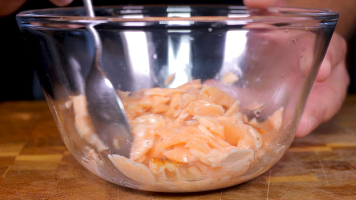 Руками разрываем отдохнувший лосось на произвольные кусочки. Если вы сделали всё в точности, как я сказал, то он получится у вас идеальной прожарки! Помещаем кусочки лосося в глубокую миску, сбрызгиваем небольшим количеством лимонного сока и перемешиваем их вместе. Те, кто не любят сочетание красной рыбы с лимоном этот шаг могут пропустить.