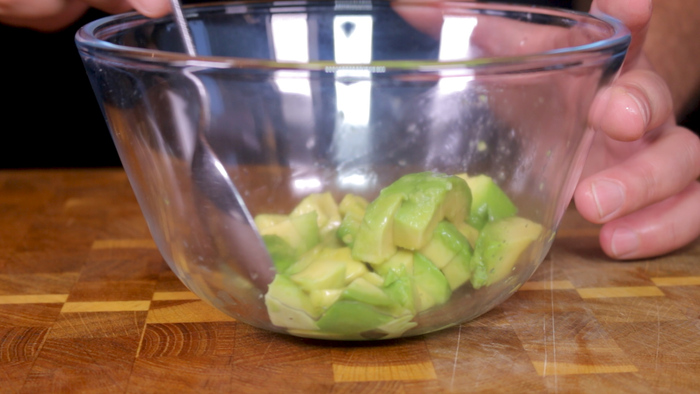 Также вместе с брускеттой с лососем я очень люблю подать к завтраку авокадо нарезанное кубиками. Его, кстати, как и рыбу, я рекомендую сбрызнуть лимонным соком. Благодаря этому кусочки авокадо сохранят свой цвет и не потемнеют.