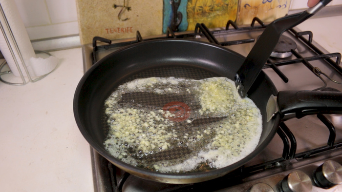 От чиабатты отрезаем два ломтика примерной толщиной 1.5 см. Обжариваем кусочки хлеба на сковороде на оливковом масле в течении 2 минут с каждой стороны до золотистого цвета и извлекаем их из сковороды.