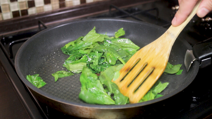 Лососю необходимо немного отдохнуть, в это время мы можем обжарить на той же сковороде немного листьев шпината. Произвольно отрываем их от веток и бросаем в сковороду, затем обжариваем в течении минуты постоянно помешивая и извлекаем из сковороды.