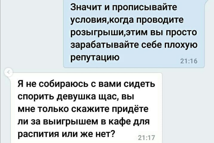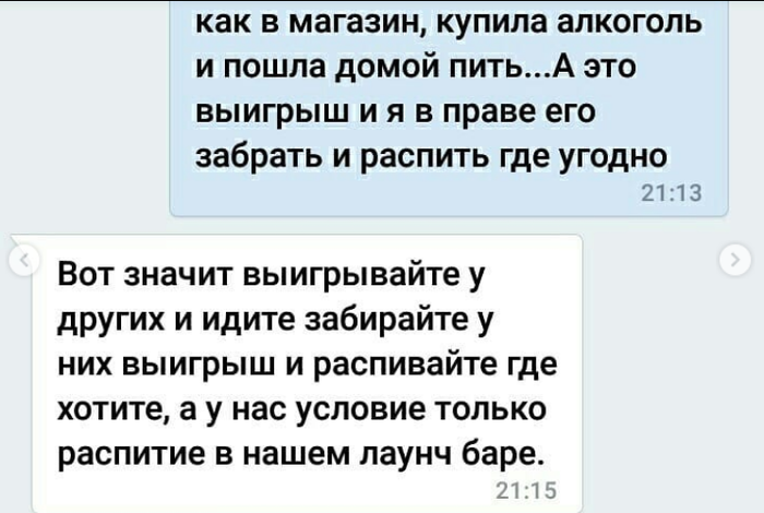 Нет! Хозяина забегаловки жаба душит! Он требует от победителя распить пузырь именно у него в заведении. Каков хитрый еврей! И получить халявных репостов, и выручку в баре поднять за счёт компании с халявным пузырём.