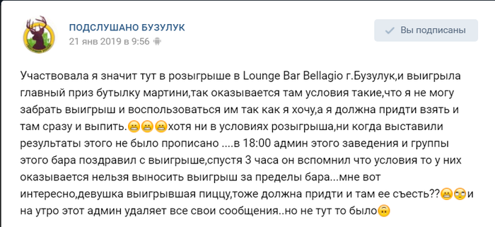 Один из призов - бутылка мартини. Какого - не указано. Хозяину забегаловки достаточно купить недорогой Delasy, вручить победителю, сделать фото и выложить в паблике.