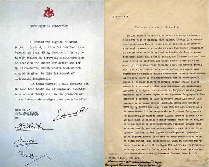 Слева на иллюстрации – подлинный акт абдикации (отречения) короля английского Эдуарда VIII. Гербовая бумага. Типографский шрифт. Подписи нескольких августейших свидетелей. Справа – бумажка, выдаваемая за «отречение Николая II». Напечатано пишмашинкой на магазинном листочке. «Подпись» карандашом. «Заверено» почему-то министром двора. ВСЁ.