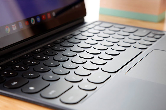 Клавиатура Google Pixel Slate выглядит как чехол у Surface Pro. Она складывается также как клавиатура iPad Smart Keyboard, но имеет оригинальный поворот. Верхний изгиб магнитами крепится к задней части устройства, что позволяет плавно изменять угол наклона одной рукой. Эта клавиатура предлагает отличный опыт набора текста. Несмотря на круглые клавиши текст набирается быстро и удобно, к тому же она очень тихая. Есть подсветка клавиш, но она либо включена, либо выключена, без всяких эффектов.