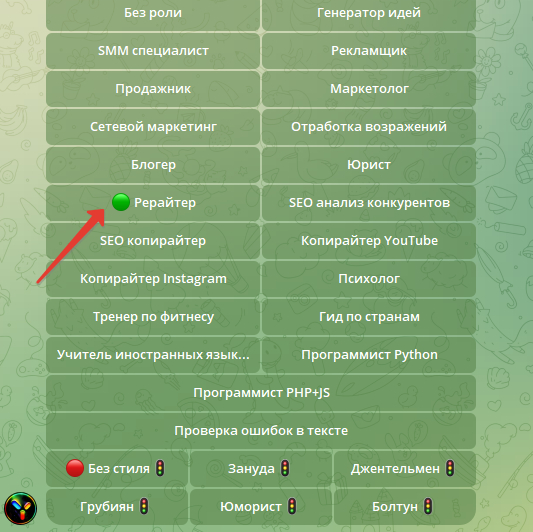 В рассматриваемом Телеграмм боте, использующем Chat GPT, имеется множество встроенных ролей, они помогают настроить работу нейросети под разные задачи. Одной из таких ролей является "рерайтер". Эта опция позволит Chat GPT ещё более эффективней переработать текст, ещё лучше адаптировать его под ваши требования и предпочтения.