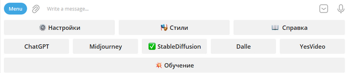 YesAIbot — один из самых функциональных ботов для создания картинок в Телеграмме. Он работает с нейросетью Stable Diffusion, включая SDXL, а кроме того - DALLE, Midjourney и ChatGPT.