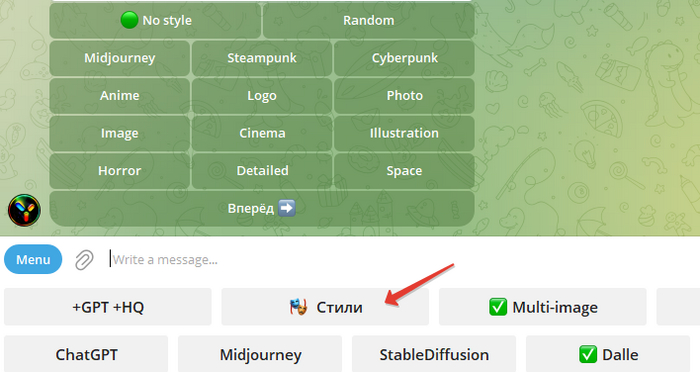 Имеется несколько встроенных стилей в этом боте для создания картинок в нейросети.