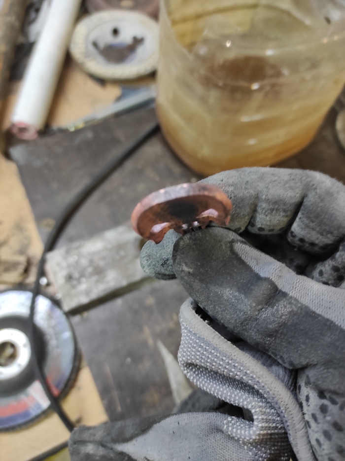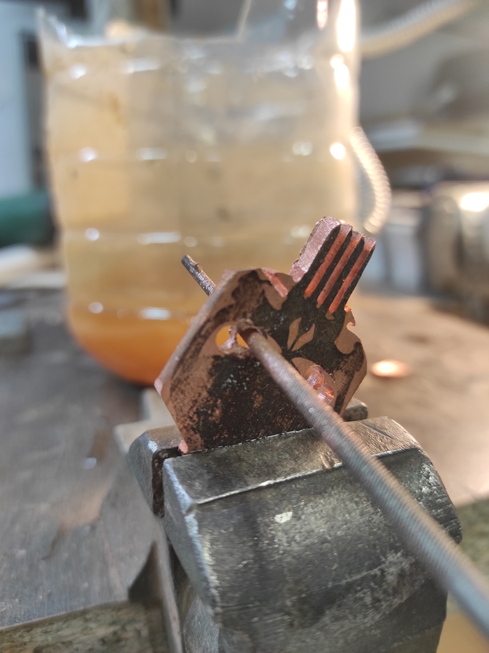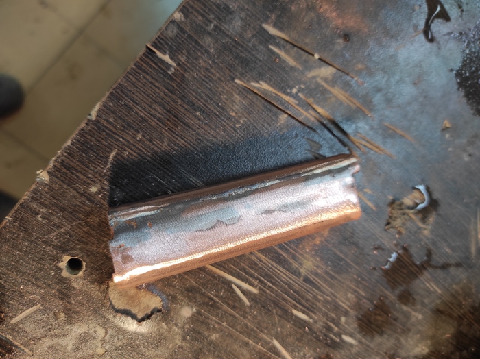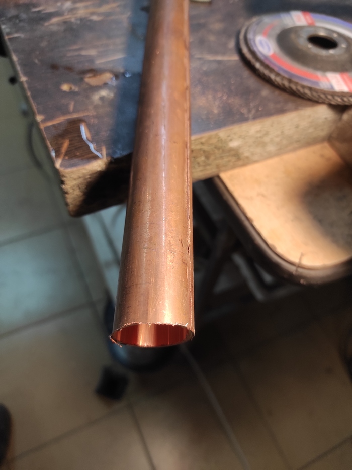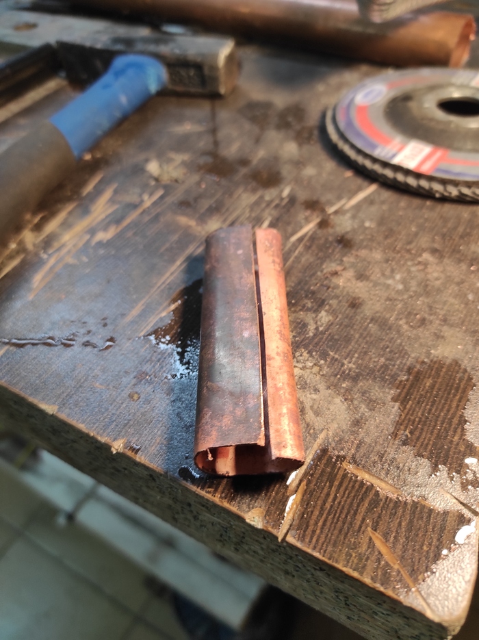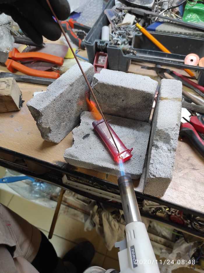 Начинаем с металла. У меня есть кусок медной трубки. Отрезаем. Отжигаем дя придания пластичности и выпрямляем кусочек.