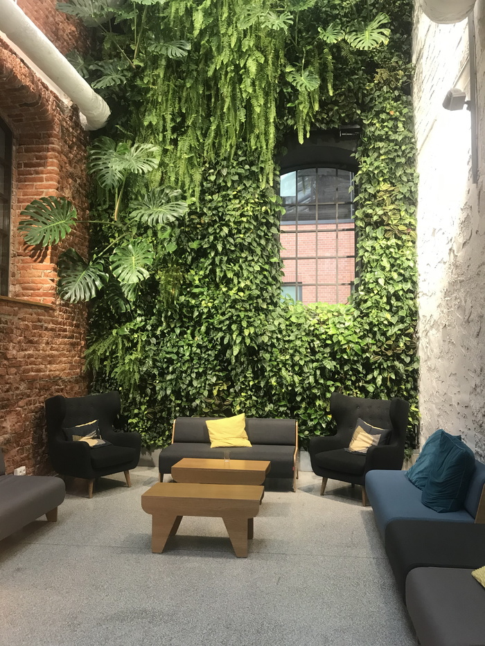Так выглядит главный холл. Зеленая стена содержит сотни горшков с живыми цветами.