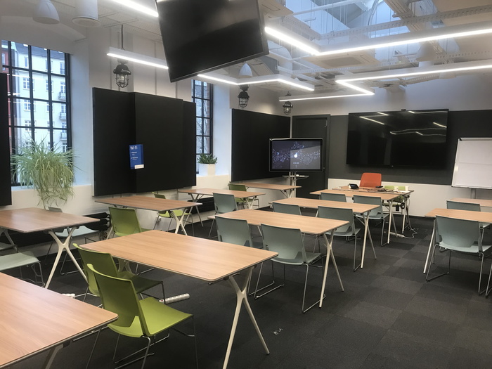 Так выглядят аудитории на втором этаже. Они доступны для резидентов и наиболее оборудованы для работы: стеклянные стены для маркерных набросков, электронные доски, комнаты переговоров и многое другое