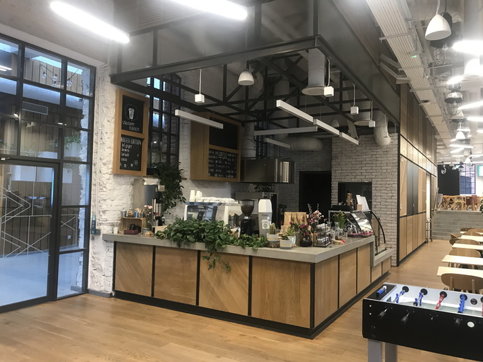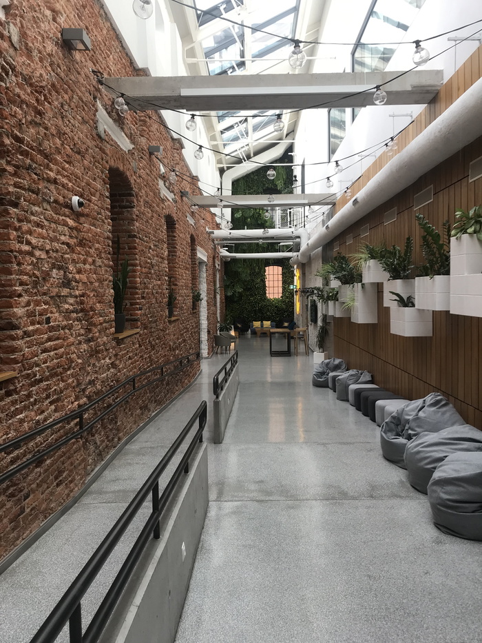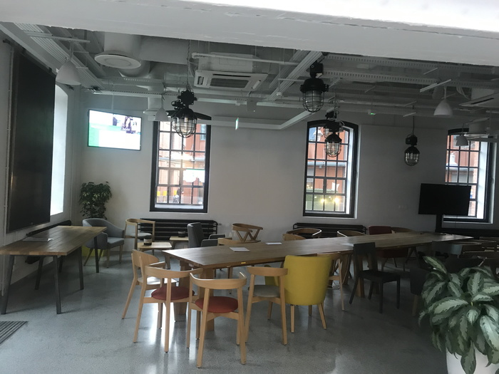 А вот так выглядит свободная рабочая зона. Она связана с кафе и имеет прямой выход на террасу. Многие резиденты также работают здесь так как эта зона также отлично подходит для знакомств с другими членами кампуса