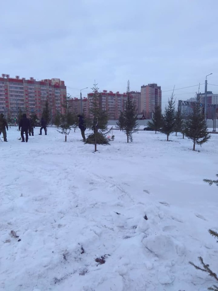 Ради XXIX Всемирной зимней универсиады в Красноярске разработали экспресс-технологию зимнего озеленения, не требующую ни копания ям для деревьев, ни даже наличия у этих деревьев хоть каких-нибудь корней. Деревья для озеленения просто срубаются, доставляются на место, которое нужно озеленить, и укрепляются в сугробах с помощью специальных металлических труб. Поскольку Универсиада зимняя и проходить будет в марте, снег до ее окончания точно не растает, деревья не упадут и не засохнут - а что будет после окончания, никого не волнует. Вот так выглядят это озеленение