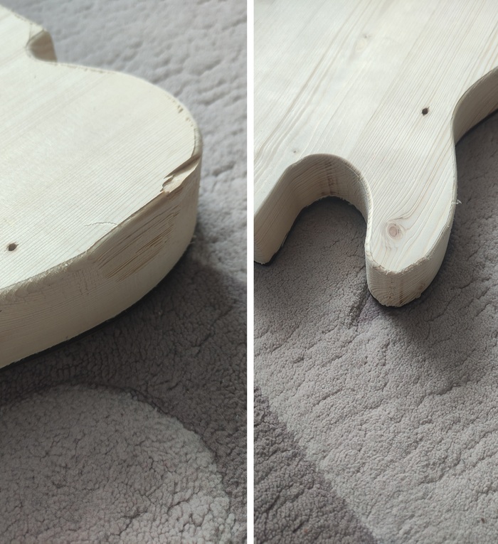 Хотелось конечно найти сухую доску, присмотрел дом под снос, хотел там подоконник прихватить, но, пока собирался, дом снесли. В итоге друг в столярной мастерской на работе нашел сосновый брус. Распилили на 3 доски и склеили вместе. Кстати, Фендер делал в самом начале телекастеры именно из сосны. Друзья, никогда так не делайте, это не гитарный материал, мы этот момент еще затронем ниже.