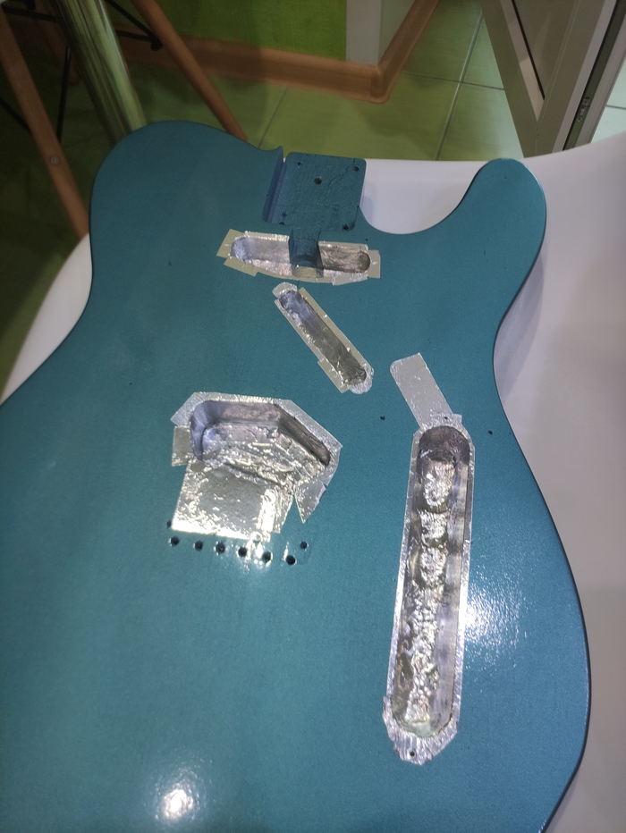 Корпус готов, гриф готов - экранируем, устанавливаем фурнитуру (все предварительно засверлив) и готово!!!