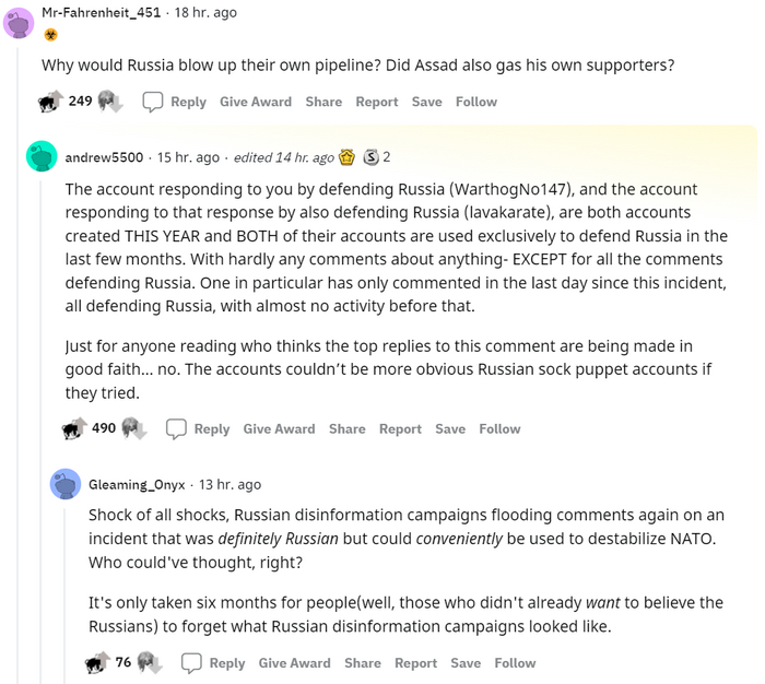 Учетная запись, отвечающая вам на защиту России (WarthogNo147), и учетная запись, отвечающая на этот ответ также на защиту России (lavakarate), созданы в ЭТОМ ГОДУ, и ОБЕ их учетные записи используются исключительно для защиты России в последние несколько месяцев. Практически без каких-либо комментариев, КРОМЕ всех комментариев в защиту России. Один, в частности, комментировал только в последний день после этого инцидента, все защищая Россию, до этого почти не проявляя активности.