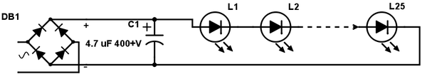 220 вольт из розетки выпрямляются и сглаживаются. На выходе получаем 310 вольт постоянного тока. Светодиодная лента требует 12В. Значит надо соединить 25 лент (по три глазка.)