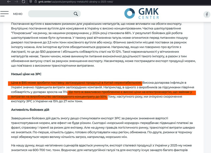 Сравниваем с мировой ценой (мировой центр ценообразования — это КНР), смотрим на сингапурской бирже цену на фьючерс на руду с поставкой в Китай — SGX TSI Iron Ore CFR China (62% Fe Fines) — видим 107,5 долларов США за тонну. Гипотеза подтверждена: украинская пропаганда взяла просто цену продажи без учёта стоимости добычи, очистки, CAPEXa на поддержание добычи и стоимость транспорта до точки продажи.
